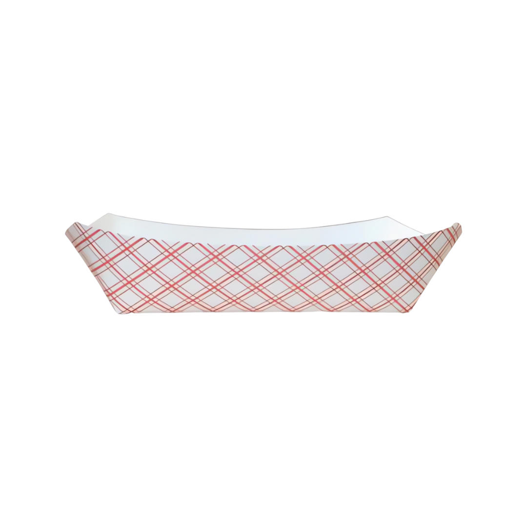 #500 Southland Red Check Food Tray, holds up to 5 lbs of hot or cold foods. Rectangular, single-use trays are made from premium clay coated paperboard. Ideal for serving full meals, including sandwiches and chips, salads, hamburgers and fries, etc.